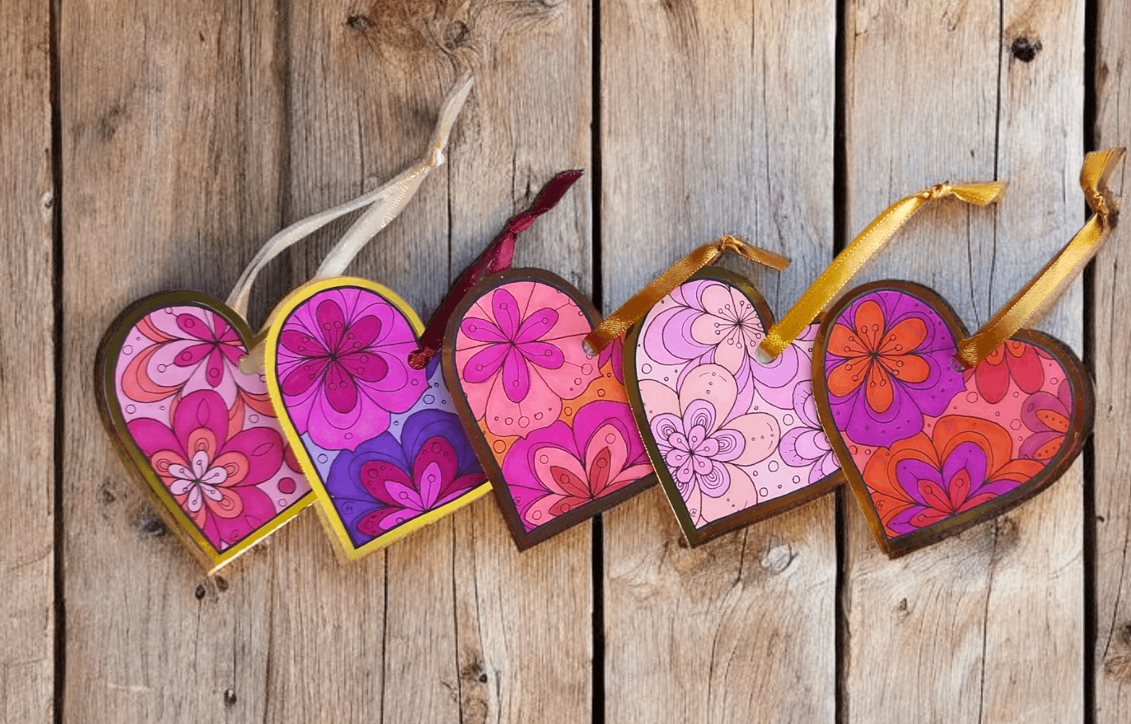 Five hearts of different green, grey and yellow colour combinations and design variation are in each set.